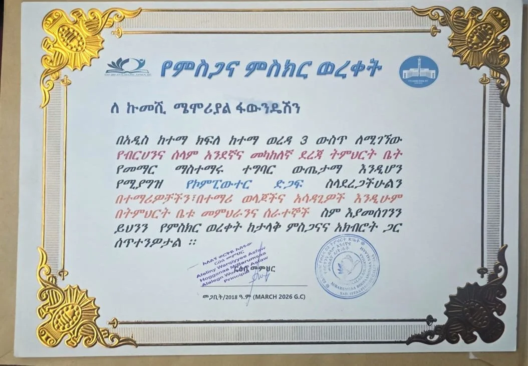Donation Upadtes-2026Kumeshi Memorial Foundation provided multiple workstations ( computers, monitors, printers, and modems) to two organizations in Addis Abeba and Awasa. KMF provided 5 workstations to Mary Jo for their new dialysis center in Awasa city and another five workstations to Berhane and Selam School in Addis Abeba.